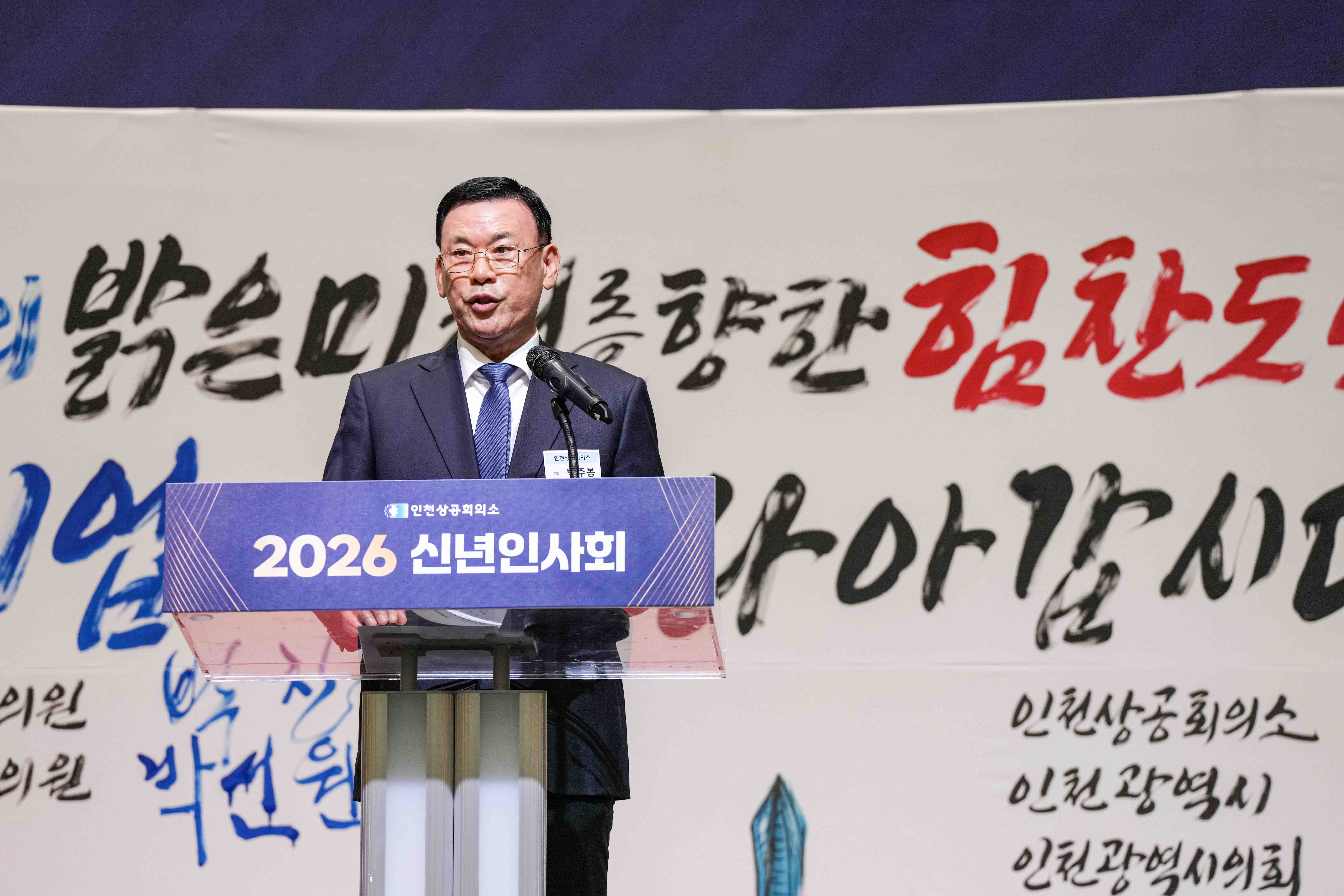 (사진설명 1) 박주봉 인천상의 회장이 신년사를 하고 있다. (사진설명 2)‘인천의 밝은 미래를 향한 힘찬 도약’을 주제로 한 붓그림 퍼포먼스에서 박주봉 인천상의 회장을 비롯해 유정복 인천광역시장, 정해권 인천시의회 의장, 도성훈 인천시교육감, 함께한 국회의원들이 서명을 하고 이를 기념하기 위해 기념촬영을 하고 있다. (사진설명 3) 2026년 신년인사회에서 주요 내빈들이 인천 경제의 새로운 출발을 기념하는 케이크 커팅을 위해 기념촬영을 하고 있다. (사진설명 4) ‘2026년 신년인사회’ 참석자 모습