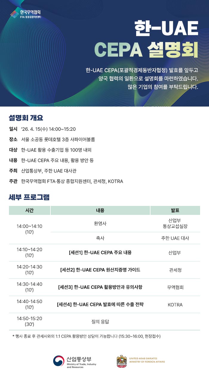 | ‒ | [한국무역협회] 한-UAE CEPA 설명회 안내 |