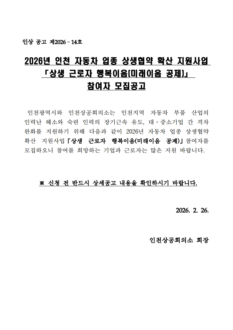 | ‒ | 2026년도 [상생 근로자 행복이음 지원사업(미래이음 공제)] 참여기업 및 근로자 모집 |