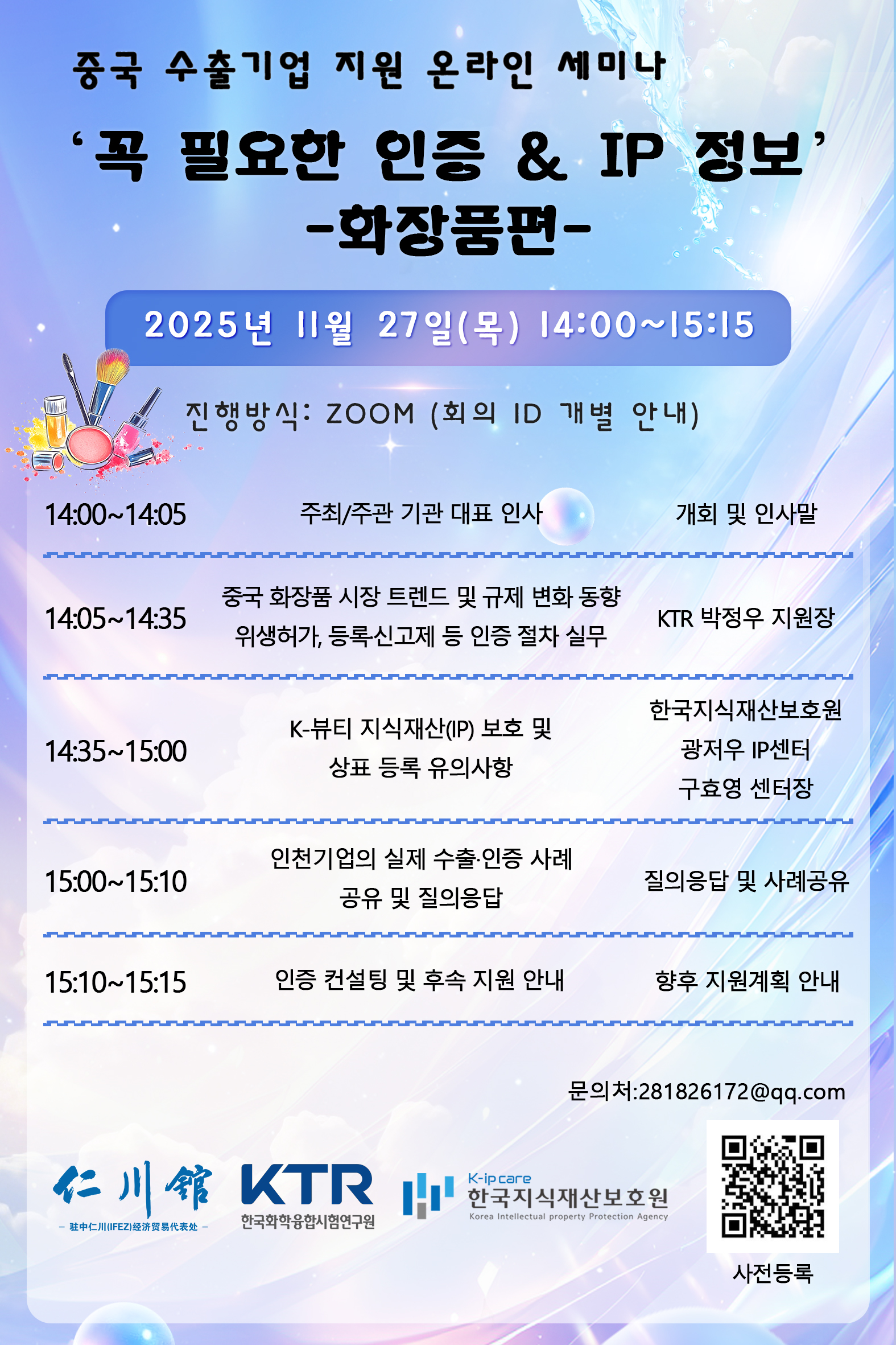| 제목 | [인천광역시]「인천 화장품 기업 대상 중국 수출지원 온라인 세미나」참여기업 모집 | ||