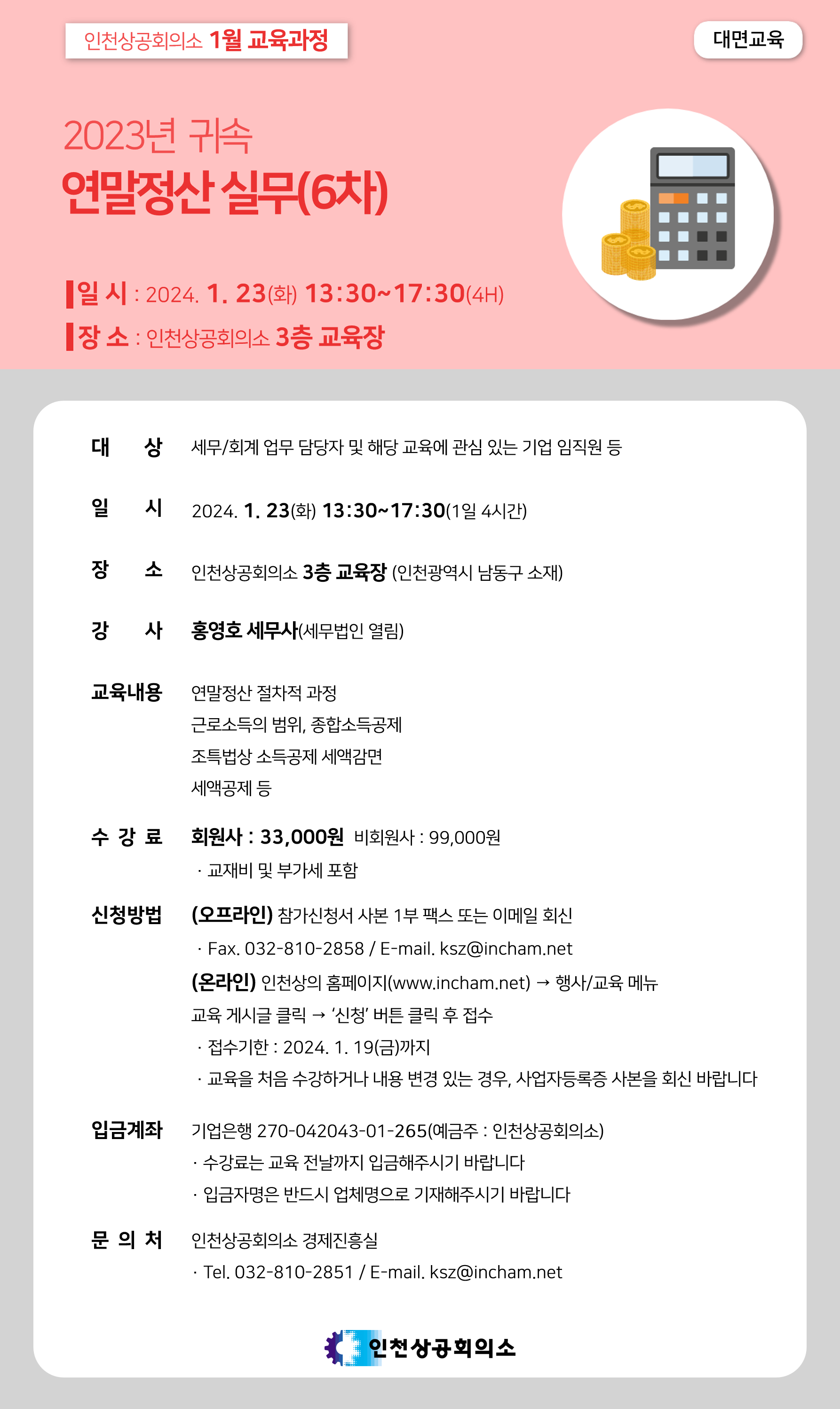 | 제목 | [오프라인 교육] 2023년 귀속 연말정산 실무(6차) | ||
