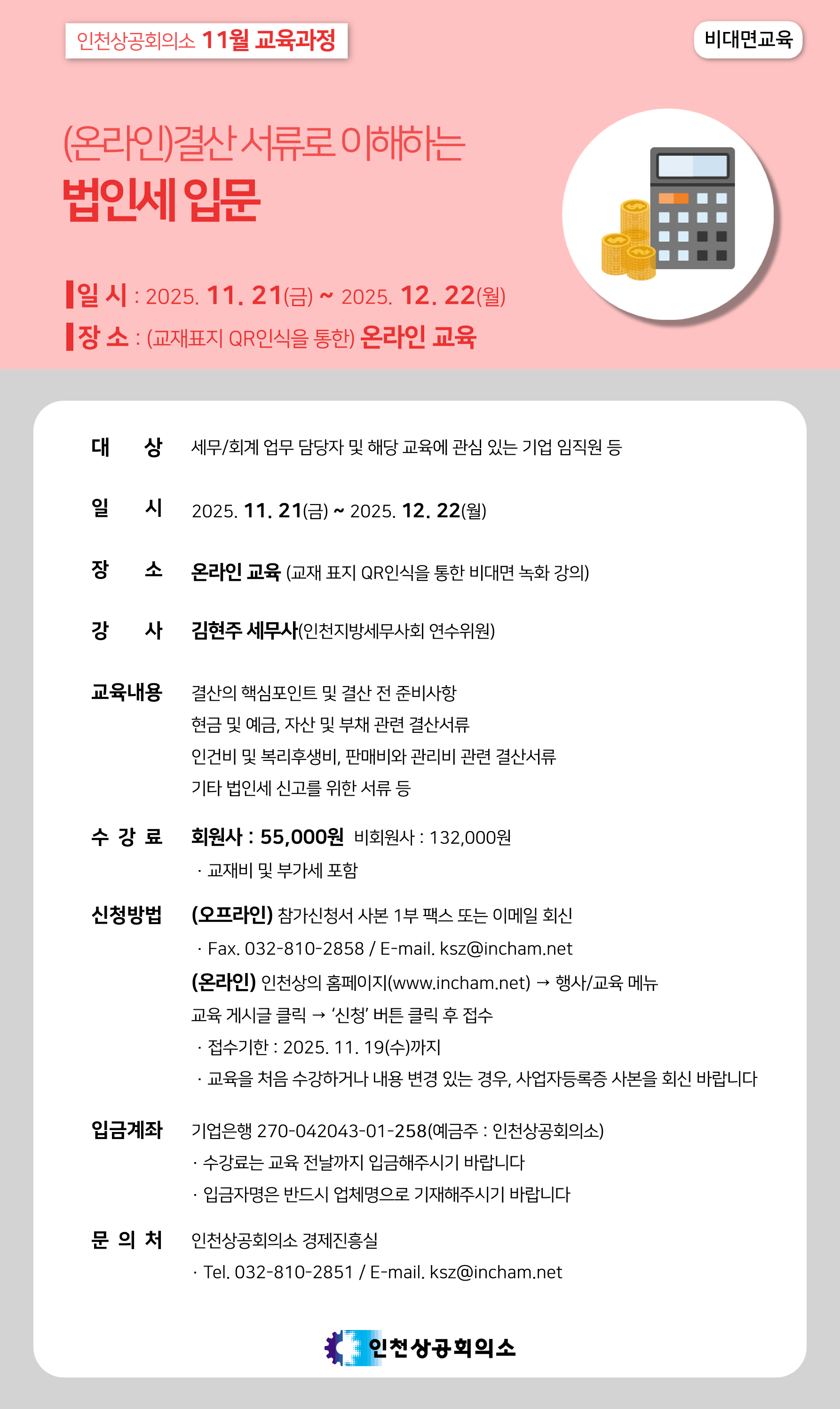 대표전화 : 032-810-2800~3, 팩스번호 032-810-2807 문의 : inchon@korcham.net
