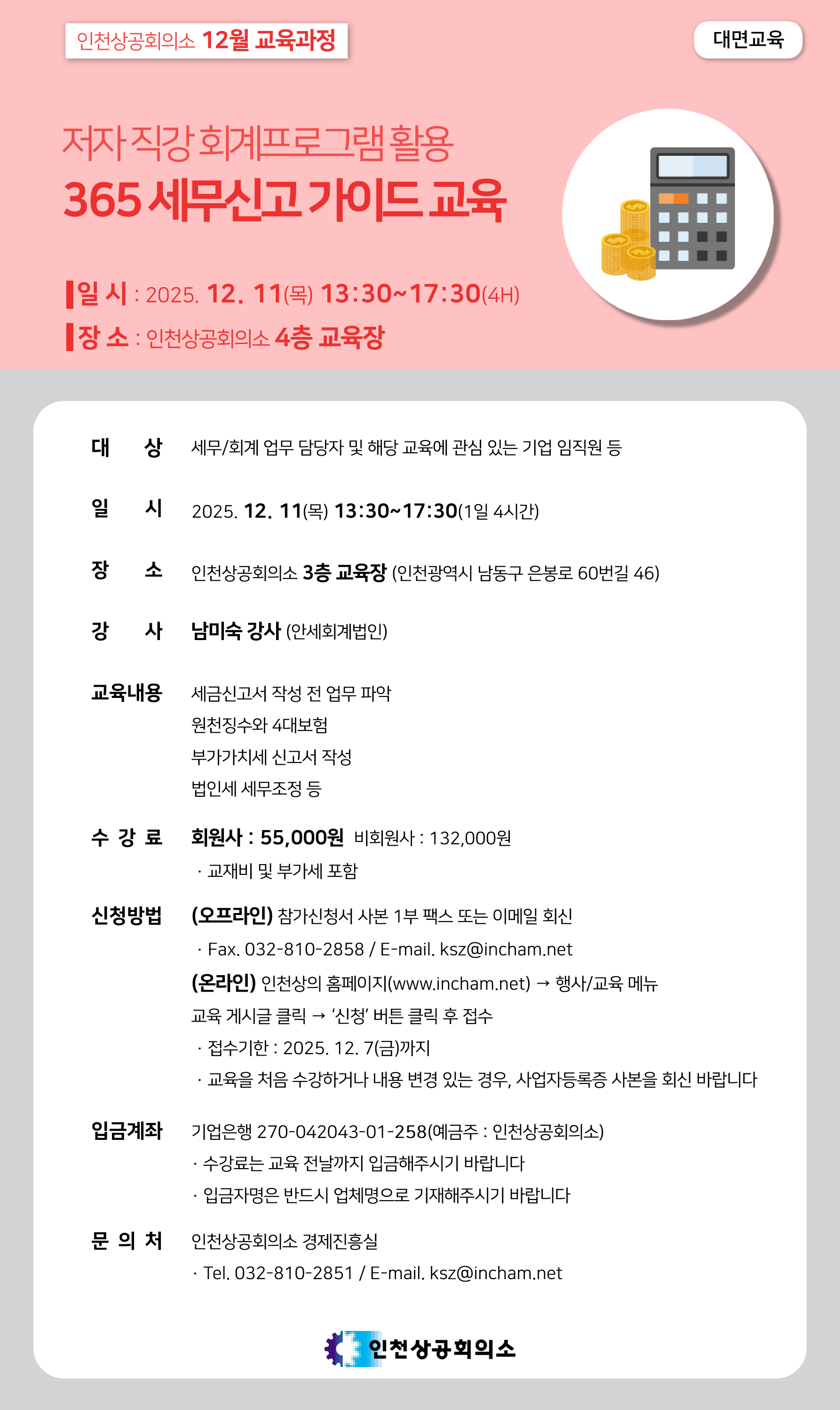 | 제목 | [오프라인 교육] 저자 직강 회계프로그램 활용 365 세무신고 가이드 교육 | ||